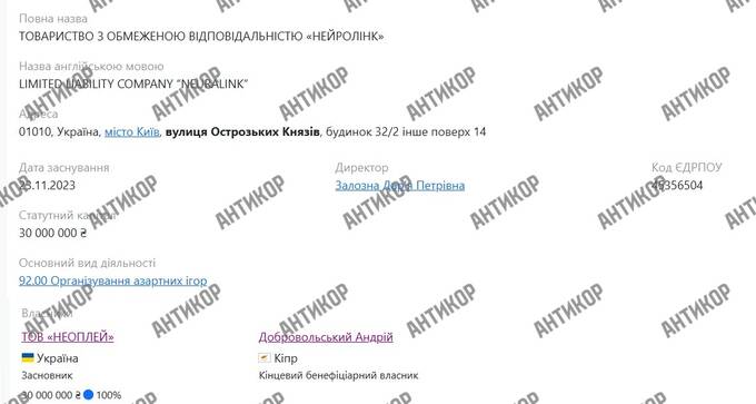 Якщо заглянути в картку компанії «Нейролінк» — оператора бренду Cosmobet, зареєстрованої в листопаді 2023 року, — виникають цілком очевидні питання: фірма зі статутним капіталом у 30 мільйонів гривень виникає з нізвідки, отримує ліцензію КРАІЛ, кінцевим бенефіціаром на початку значиться Зборовський. Формально він і був власником. Але ланцюжок подальших подій говорить про інше.