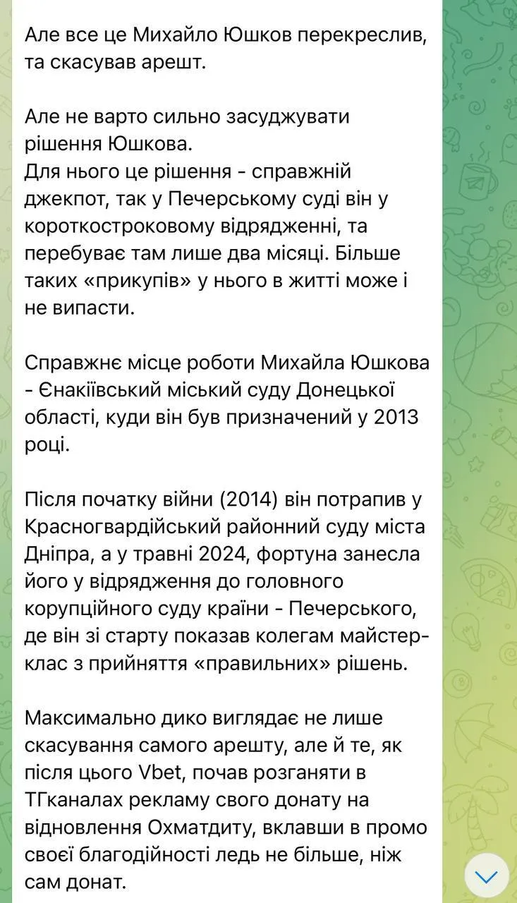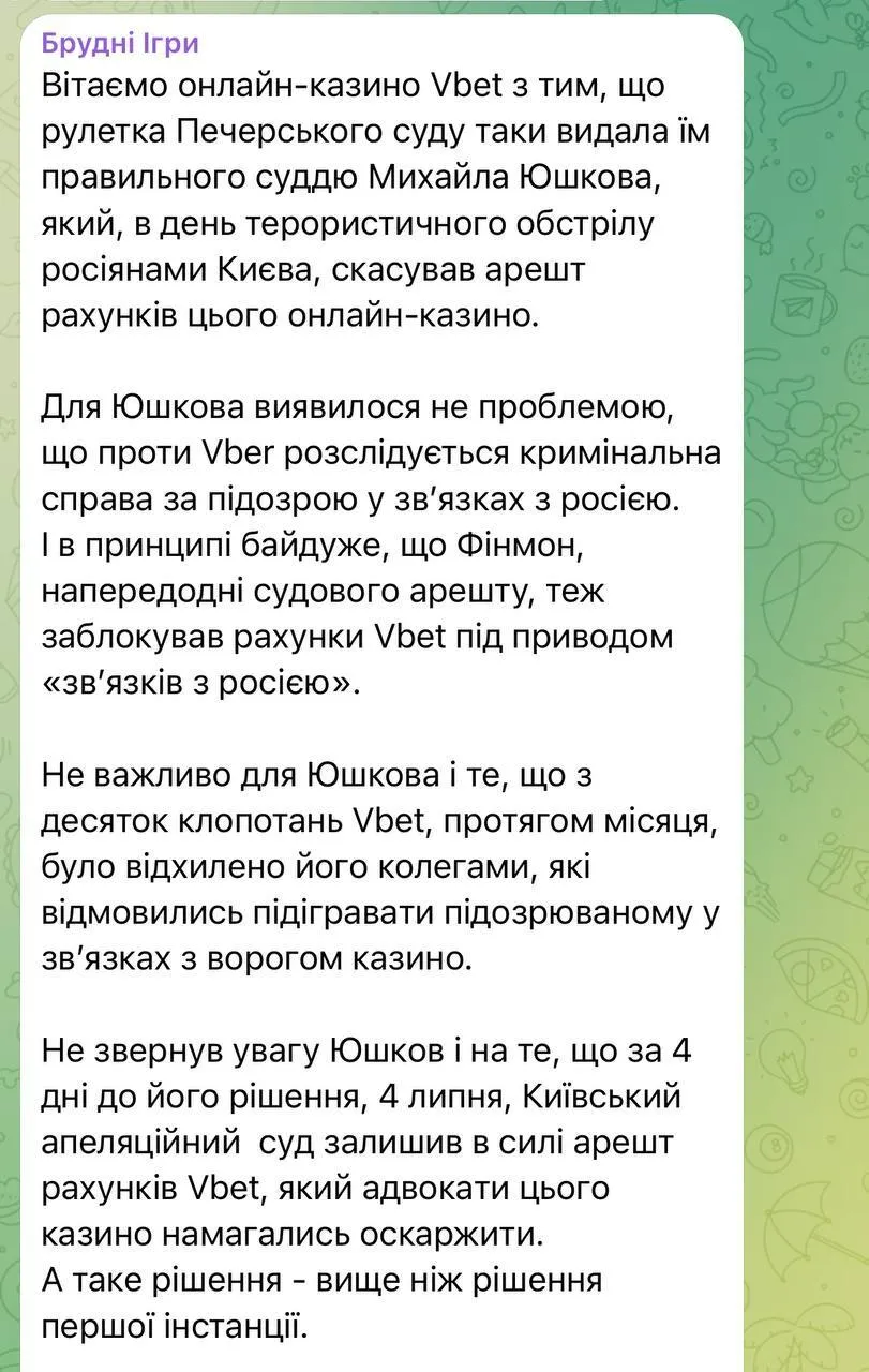 Найгучнішим епізодом стало рішення Печерського районного суду Києва в липні 2024 скасувати арешт рахунків VBet, попри те, що кримінальне провадження триває, а раніше десятки суддів і навіть Київський апеляційний суд за чотири дні до цього підтвердили законність арештів. Рішення ухвалив суддя Юшков, чим викликав критику з боку громадськості та експертів. Слід зазначити, що фінансовий моніторинг заблокував рахунки ще до судового рішення, враховуючи ті ж підозри у зв’язках компанії з російським капіталом.